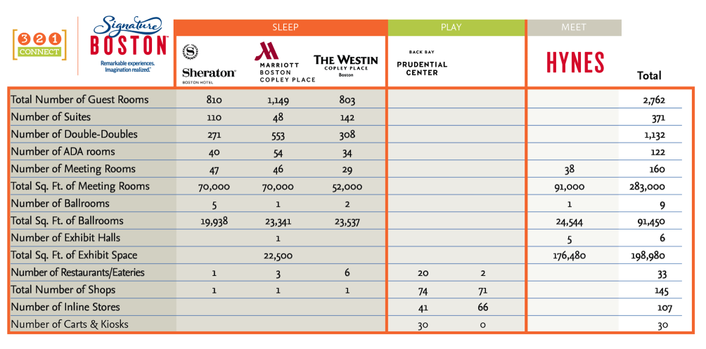 The one-of-a-kind Hynes Convention Center is the best-located, best-connected convention center in North America. The Hynes is better than ever with stunningly redesigned convention, meeting, ballroom and common areas. Only 15 minutes from Boston’s Logan International Airport, the Hynes is the centerpiece for the outstanding hotels, shopping, restaurants, and nightlife that represents 3-2-1 Connect.