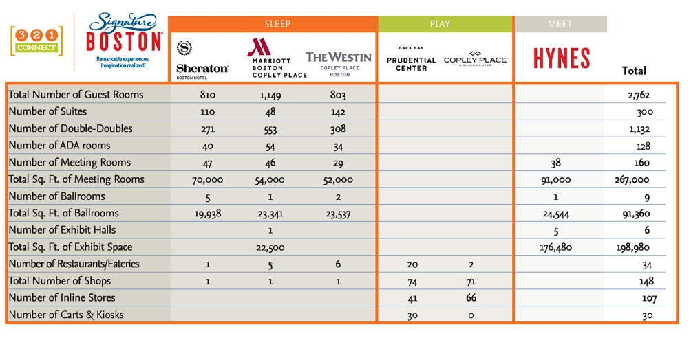 Three beautiful, world-class hotels add up to one great event for you. The Sheraton Boston Hotel, Boston Marriott Copley Place, and The Westin Copley Place, Boston feature over 2,700 hotel rooms and nearly 200,000 square feet of meeting space. You’ll consolidate your housing solutions, minimize transportation challenges, and put Boston’s best dining and shopping on every attendee’s doorstep.